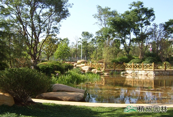 該工程地處昆明市呈貢縣吳家營鄉小尖山西北附近,為大型綜合性園林景觀工程,內容包括硬質景觀、綠化種植和水電工程等。工程遵循“顯山露水、山水圍建筑”的設計原則,通過空間體系的構筑,將現代中式建筑風格與昆明歷史文化相融合,借助多種造景手法,營造出中國古典園林與云南地方風貌相結合的山水園林景觀。