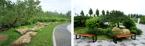 此外,工程中還用到了很多的景觀石,據高經理介紹,這些產自山東的龜紋石,質地堅硬,表面紋路獨特,主要用于上、下層苗木之間的過渡,相鄰景觀節點的分隔處,以及草坪中的點綴等。這些看似隨意但卻自然、和諧的景石擺放,讓生活在都市里的人們感受到了山之秀美、林之繁茂,就像一首無言的詩,一幅立體的畫,和著自然的旋律"輕歌曼舞"。