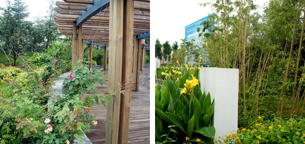 每個景觀節點上,植物的配置方法都是不一樣的,如在下沉廣場,主要是以小龍柏、金葉女貞等小灌木片植成方形或弧形,間或點綴石楠、梅樹,看起來規整、簡潔;而在設計風格為江南園林的南廣場上,是將貴重的造型油松單植,通過不同的組合,形成三個風格相近的綠島,周邊種植美人蕉、玉簪、竹子,并砌起白墻,上面開圓形拱門或圓窗,散發出詩意江南的靜謐和婉約氣息。"游憩步道是貫穿整個景觀的軸線,為了形成曲徑通幽的景觀效果,我們將對植、孤植、叢植都多種方法結合運用,特別是在三叉路口,多種植海棠、櫻花、杏花等,一方面,花開的時候,綠葉間繁花點點,會吸引人們不斷向前探尋更多的美景;而花落之后,茂密的枝葉又形成隱隱約約的視覺感受,前方轉過彎后風景什么樣,又讓人很想去看看。"高經理笑著說。