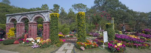 組織參展情況:作品共使用菊花2000余盆,造型菊花25盆,其他外進各類容器苗共80余盆,草坪翻新60方,本著生態的原則,施工過程中盡可能的保留了原有植物以及地被,并結合原地形造景,搭建園藝磚景墻一堵,木平臺18方,主要材料為老石板、青磚、松鱗等的生態園路(無水泥基礎)貫穿其中。由專業班組設計施工,歷時20天。菊花展開展以后由2名專業養護人員每天到場維護管養。