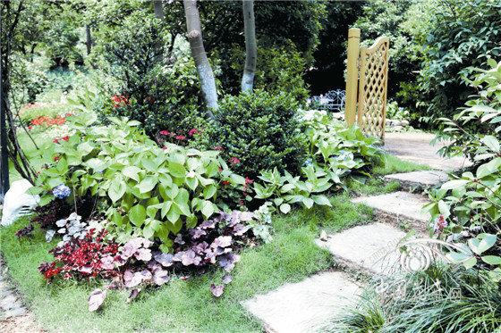 林蔭景觀 結合原有桂花,中層配植美人蕉、小葉蚊母,底層種植玉簪、落新婦、百子蓮、九頭獅子草、火炬花等,形成以粉色為主色調的林蔭景觀。