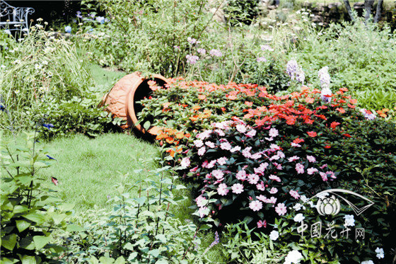 陶罐花溪景觀 以冰生溲疏為背景,通過陶罐的配置,組合搭配超級鳳仙‘桑蓓斯’、天竺葵、紫嬌花、粉花繡線菊、紅花鼠尾草、姬小菊、九頭獅子草、大花飛燕草等,形成以紅色調為主的陶罐花溪景觀。遠遠望去,仿佛一道絢麗的花海從陶罐中傾瀉而出,汩汩地流向遠方。