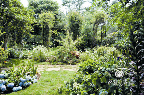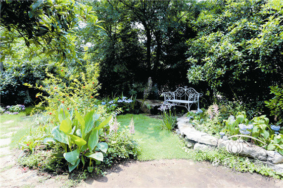 內部八仙花花園,以櫸樹、景石、石籠擋墻及園路圍合成半開敞空間,以八仙花為主材,搭配鳶尾、石榴、落新婦、百子蓮等,組成3個花境組團,與白色座椅形成半私密的花園景觀。